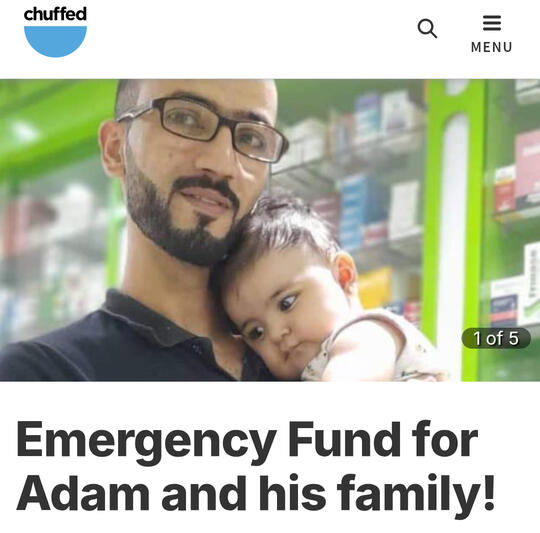 Adam and his wife Iman really need your support! The war on Gaza cost Adam his livelihood and income as a pharmacist. Adam and Iman have two young children, Omar and Ruba.In September 2025, their shelter in Central Gaza was attacked. They really need your support to keep going! Everyday essentials like food and diapers are extremely expensive, and Adam needs your help to get these for his children.IG: adammspeaksChuffed Link